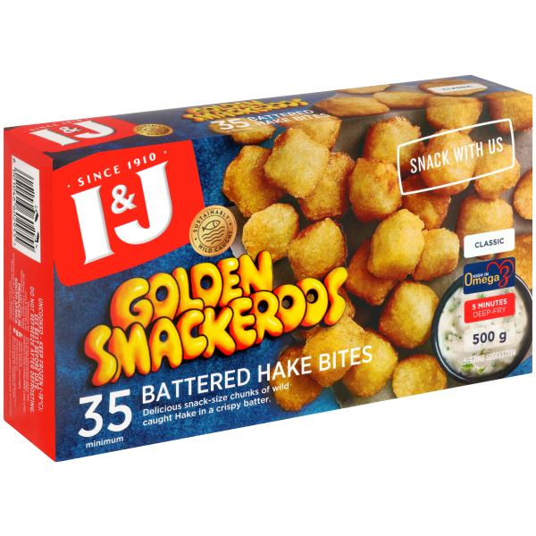 I&J GLDN SMACKEROOS BTRD HAKE BITES 500G FISH
